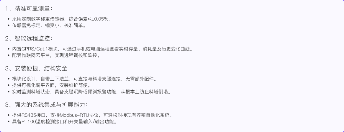 我公司基于长期筒仓测量经验,专为养殖料塔研发了料塔称重物联网系统。该系统可实时测量1-60吨饲料存量,通过称重传感器感知物料压力,结合标定算法精准反映仓内余量。配套上安装法兰可直接与料塔型材支腿稳定连接,无需额外配件,有效解决传统结构缺陷,防止倒塌事故。现已广泛应用于各类养殖场,性能稳定可靠。