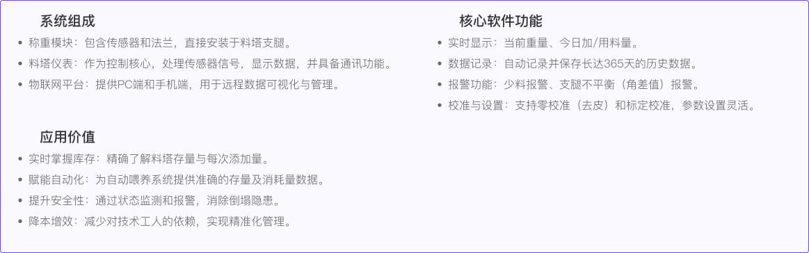 我公司基于长期筒仓测量经验,专为养殖料塔研发了料塔称重物联网系统。该系统可实时测量1-60吨饲料存量,通过称重传感器感知物料压力,结合标定算法精准反映仓内余量。配套上安装法兰可直接与料塔型材支腿稳定连接,无需额外配件,有效解决传统结构缺陷,防止倒塌事故。现已广泛应用于各类养殖场,性能稳定可靠。